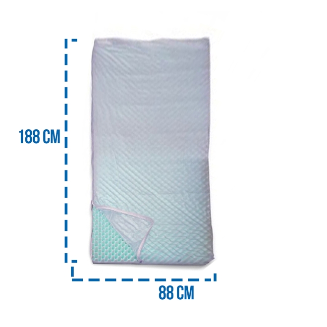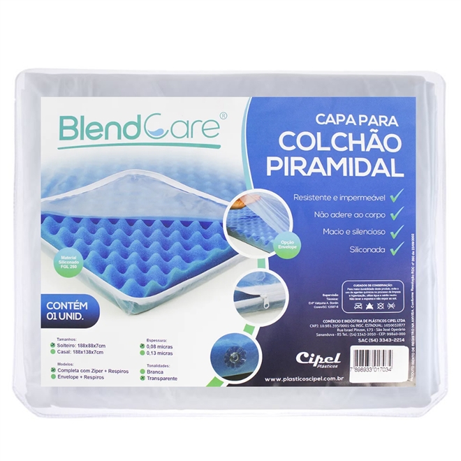A Capa siliconada com zíper possui a finalidade de proteger e aumentar a vida útil do colchão piramidal. Por possui o zíper fica fácil de remover o colchão quando da necessidade de lavar a capa. Por ser fabricada em silicone não é desagradável como os plásticos normais, a capa é silenciosa e macia.